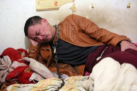 When his family left him, Zhang was devastated, and the misery drove him to the extreme decision of home imprisonment. Quitting cold turkey has been torturous for him, so much so that he cries all the time and beats himself up with the chains. He becomes very irritable at times and tries to pick the lock or slide the chain off his neck. So far he has only managed to hurt himself even more.
