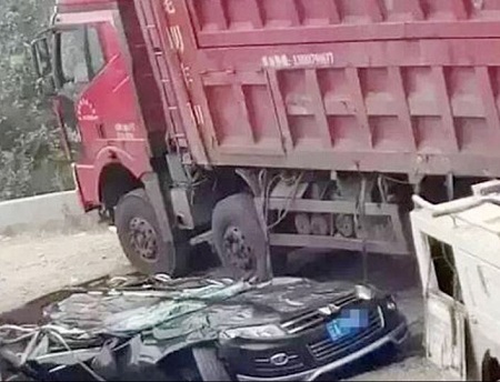 The couple in the car were killed instantly. The lorry is reported to weigh more than 100 tonnes and was carrying around 80 tonnes of coal. A traffic police officer warned after the incident that cars 'should keep a safe distance from trucks'.